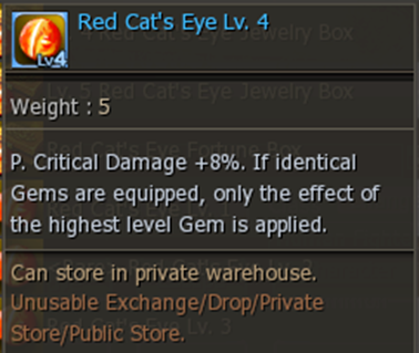 Daño Crítico P. +8%. Si se equipan gemas idénticas, solo se aplica el efecto de la gema de mayor nivel.